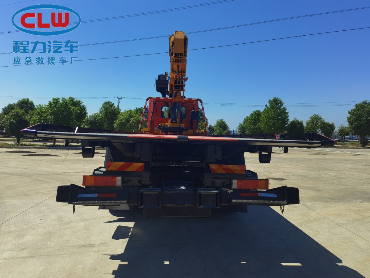 一拖二上裝配置:雙側聯動操作裝置,6個厚的花紋板,雙油缸,13噸平板,13噸3節后拖臂,10噸絞盤(35米鋼絲繩),4根綁帶,L型抱胎架一對,抱胎筒一對,小車1對,3對拖叉,1對鋼板吊耳拖叉,1對拖叉座。板長8.6米,寬2.55米